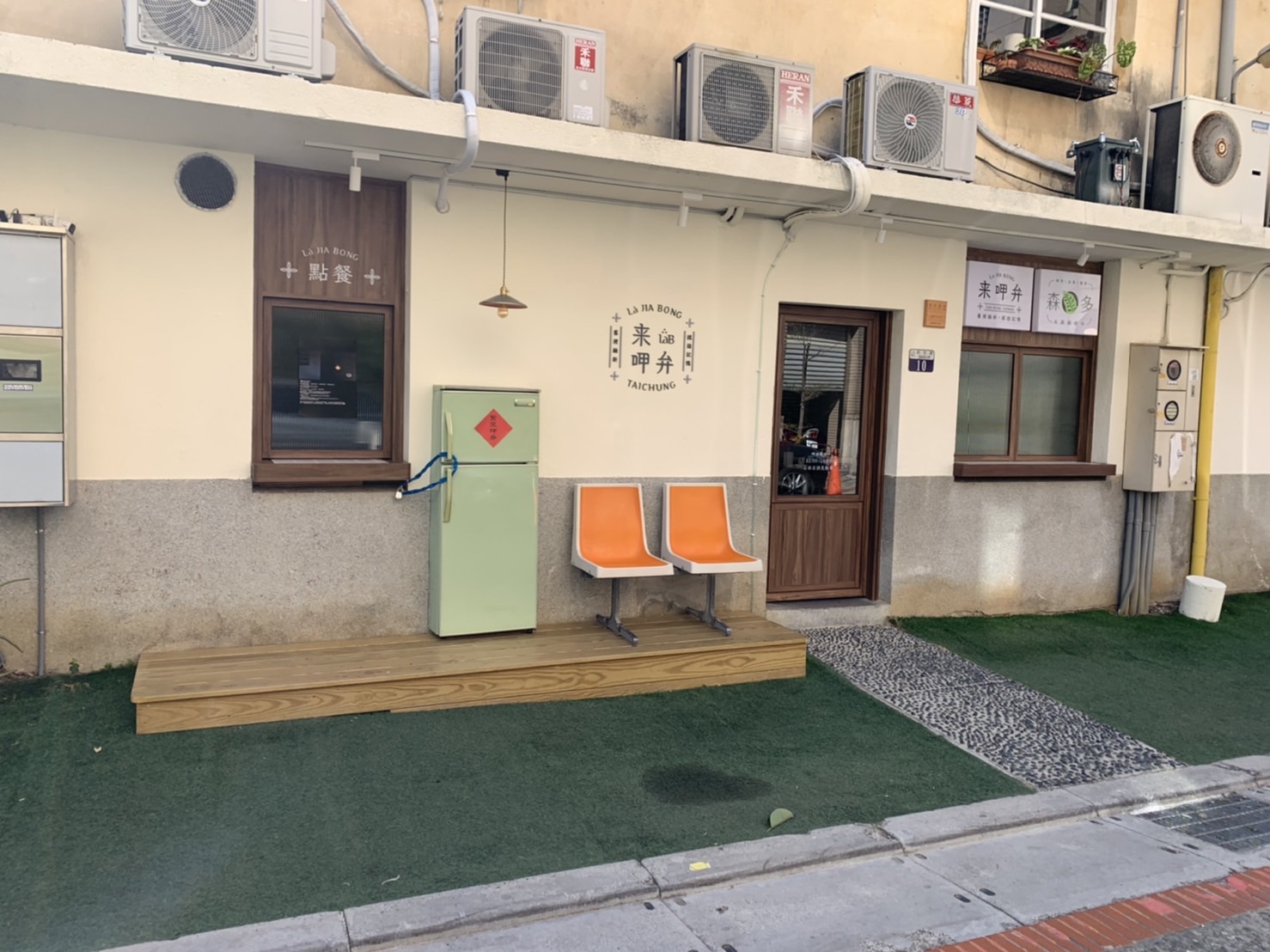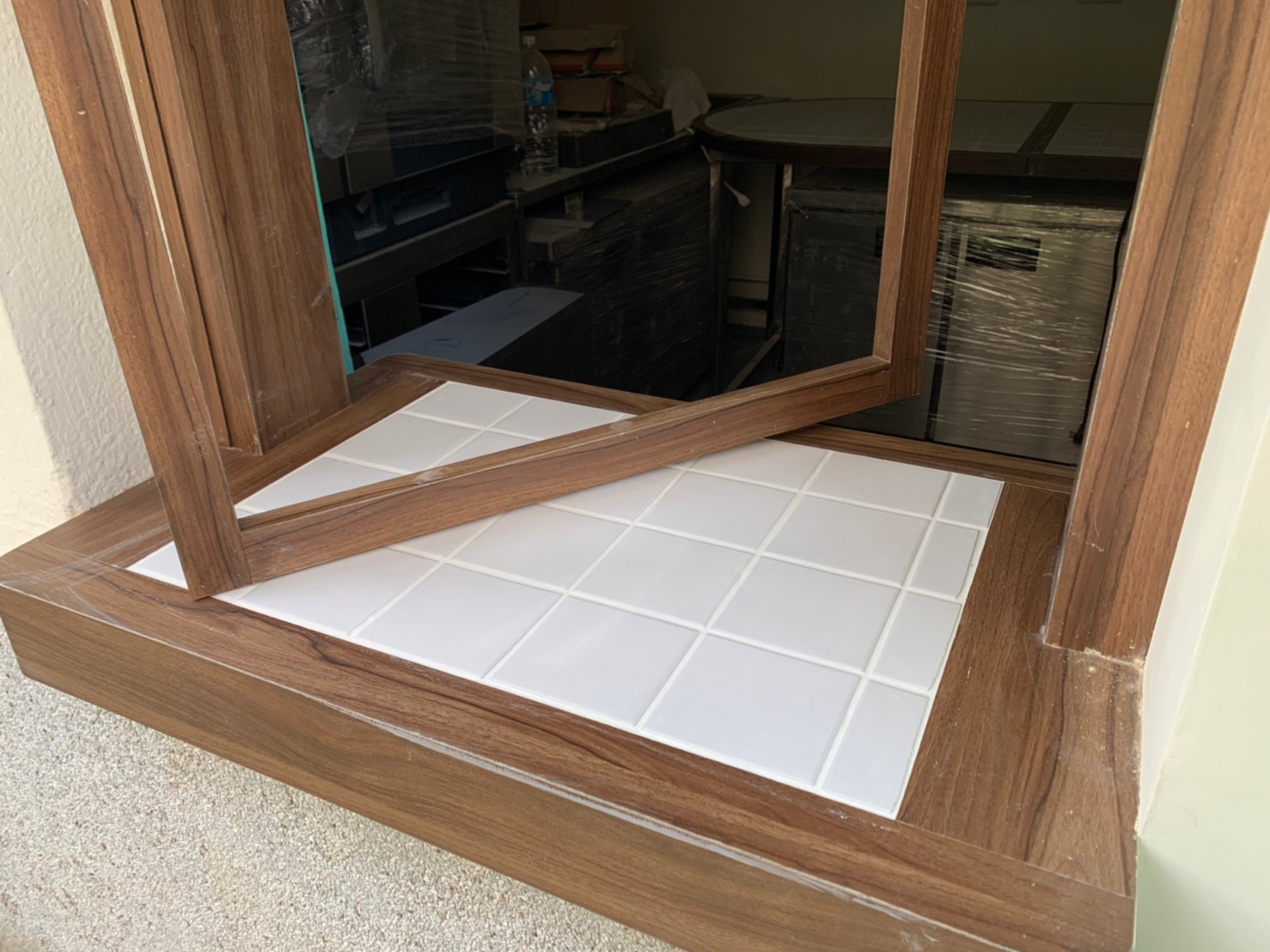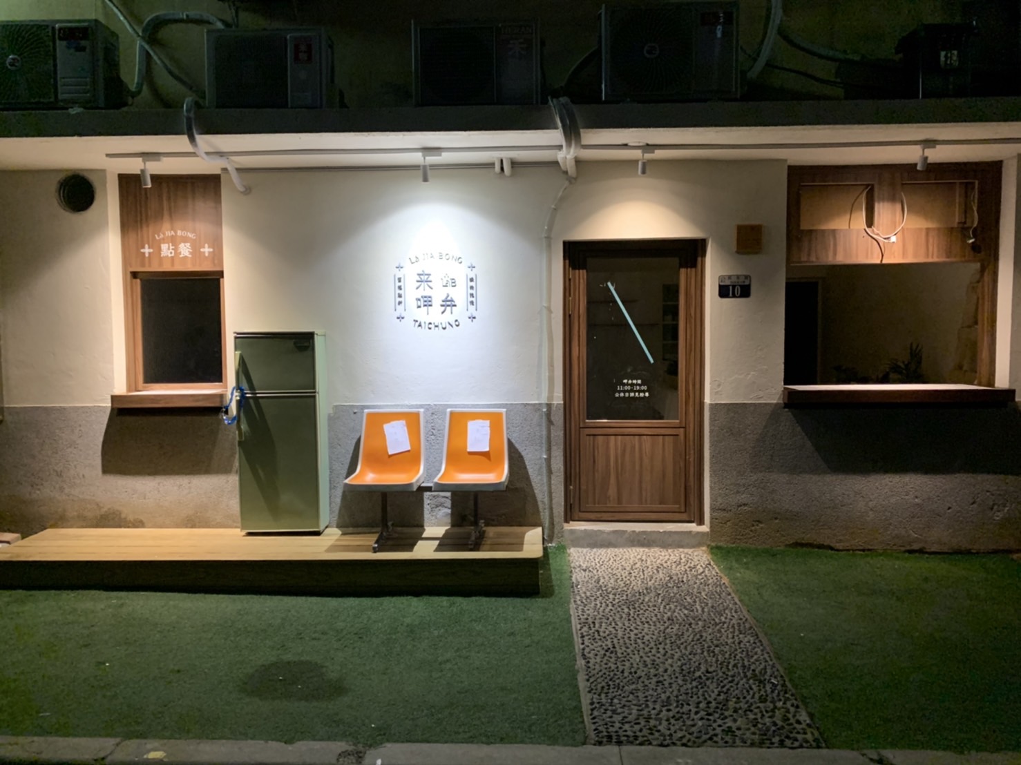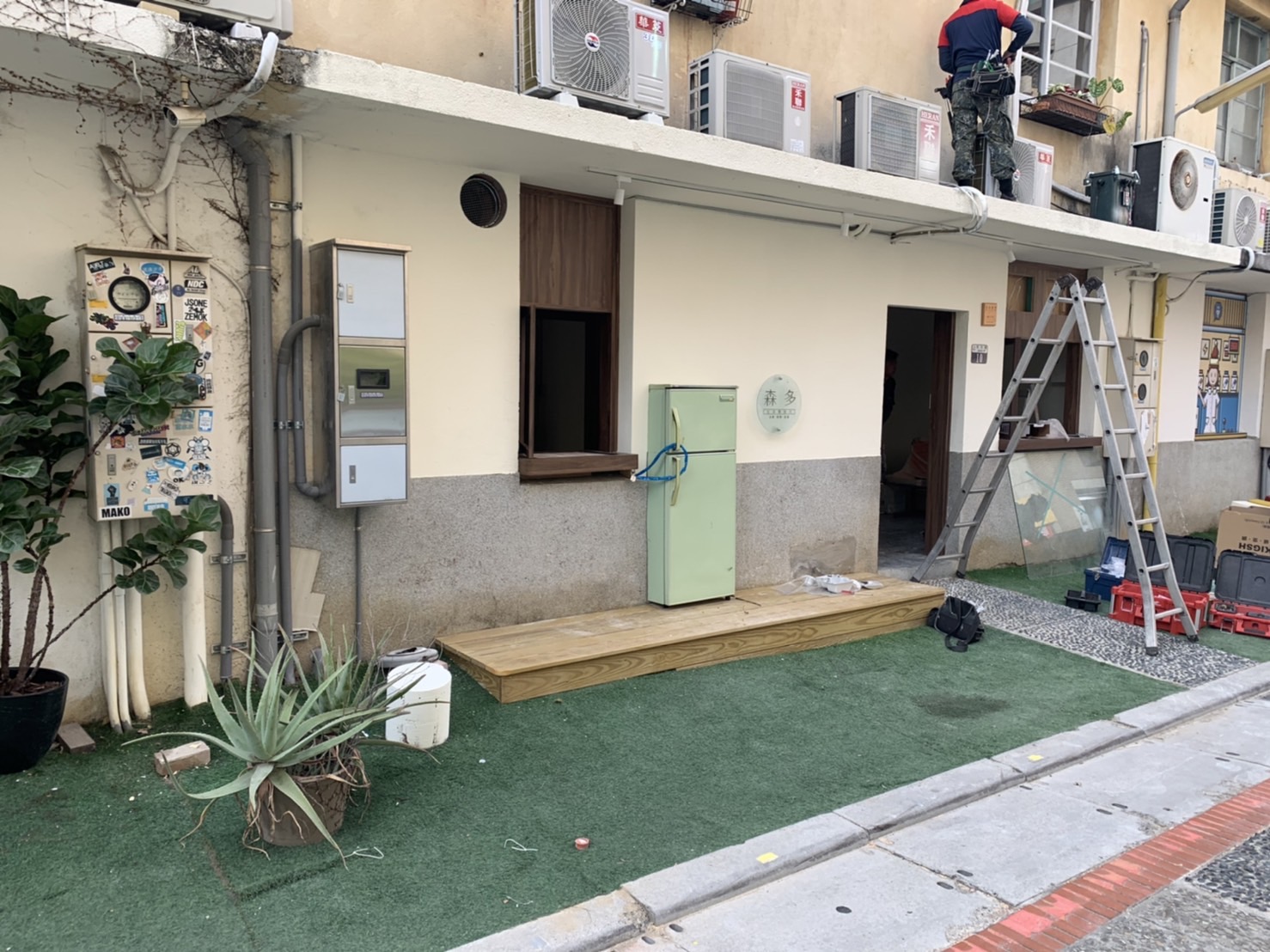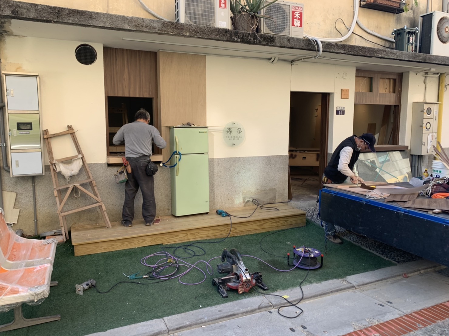(2)出餐口:業主在日本有看到一家很酷的店用老舊冰箱當作出餐台的裝飾,所以他就弄了一台冰箱來,由我們切割成適合的造型,安在預設好的平台上,並將冷凍庫後方鋸開製作出一個出餐口。出餐檯面貼 10x10 磁磚。