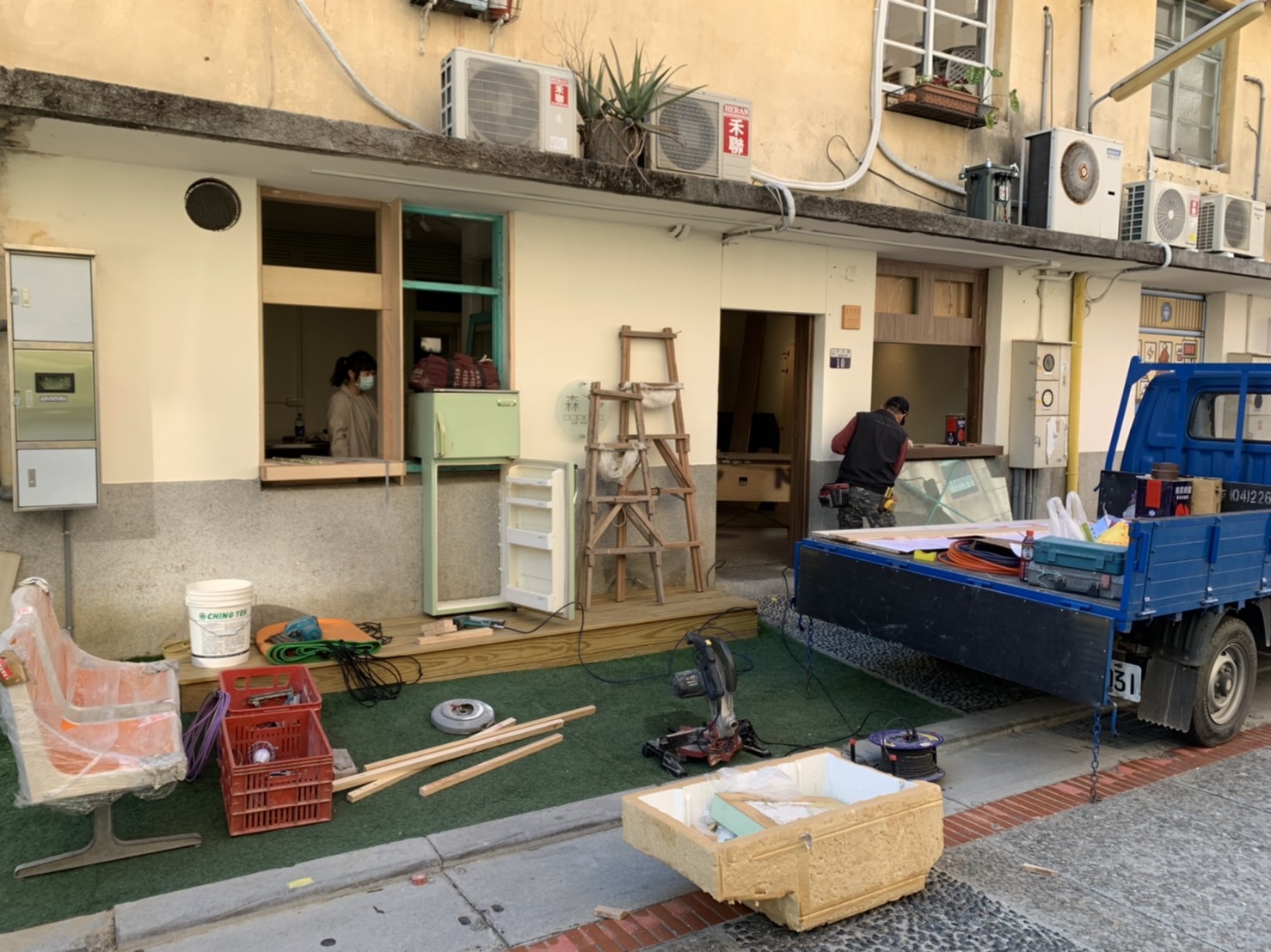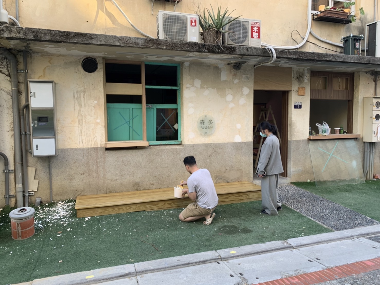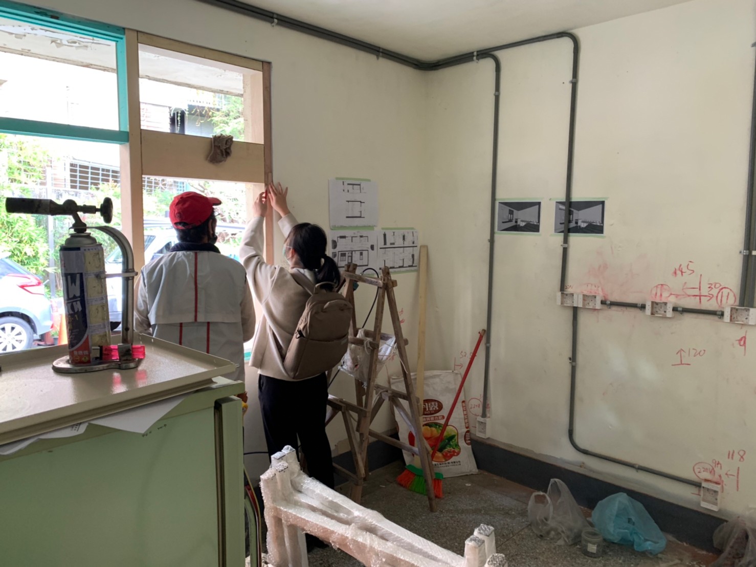 (2)木工進場:審計新村為市政府委託民營的單位,所有的動工需經過審查、且現況的窗台、門組不能拆除,退租後必須交還給管理單位,因此,門窗部分大多數是在進行包覆工作;另一方面,工作檯有特殊的設計,現場有蠻多次的來回,都是在討論相關的作業細節。