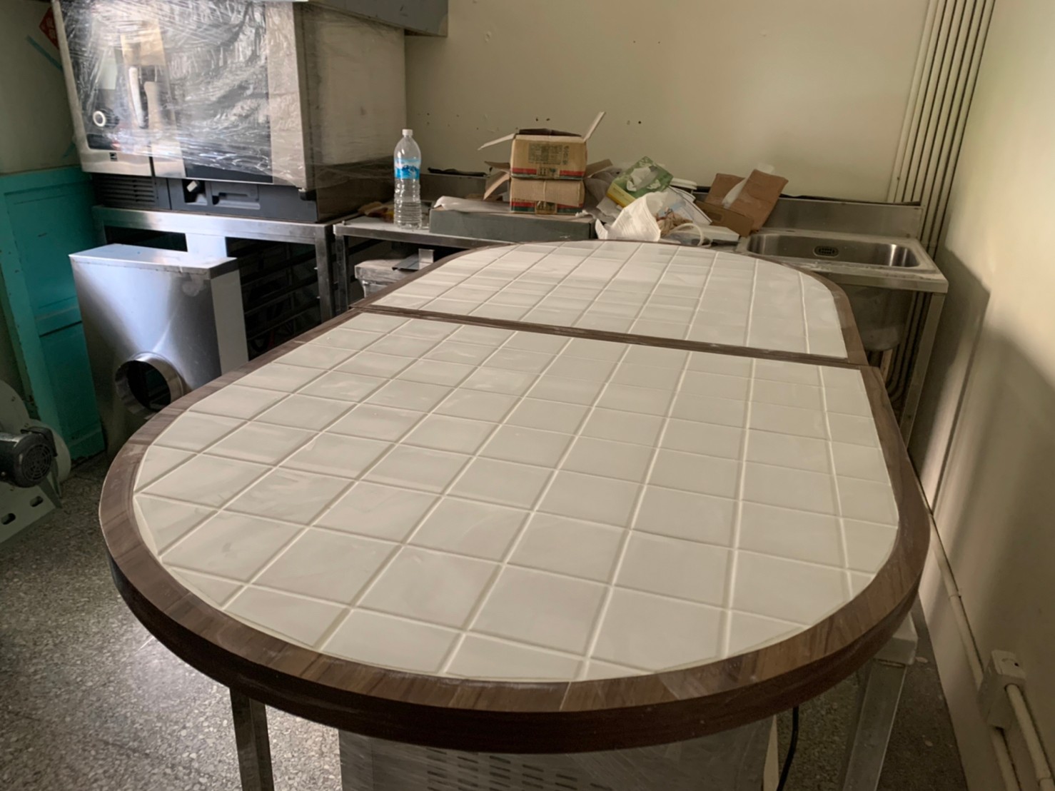 (3)木桌:需要兼具收納功能,又好放置物品,桌面希望是橢圓形可拆卸並分成兩組,桌面要倒圓、貼 10x10 磁磚。於是我們先訂製兩組鐵件桌腳烤白漆,摺起來就收起來了,放牆邊不礙事。95x95 的桌面請木工慢慢導圓,最後再請磁磚師傅鋪設後填縫。
