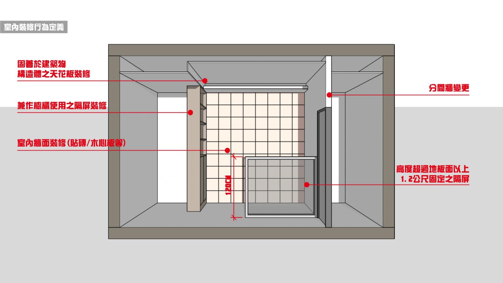 三、高度超過地版面以上一點二公尺固定之隔屏或兼作櫥櫃使用之隔屏裝修。