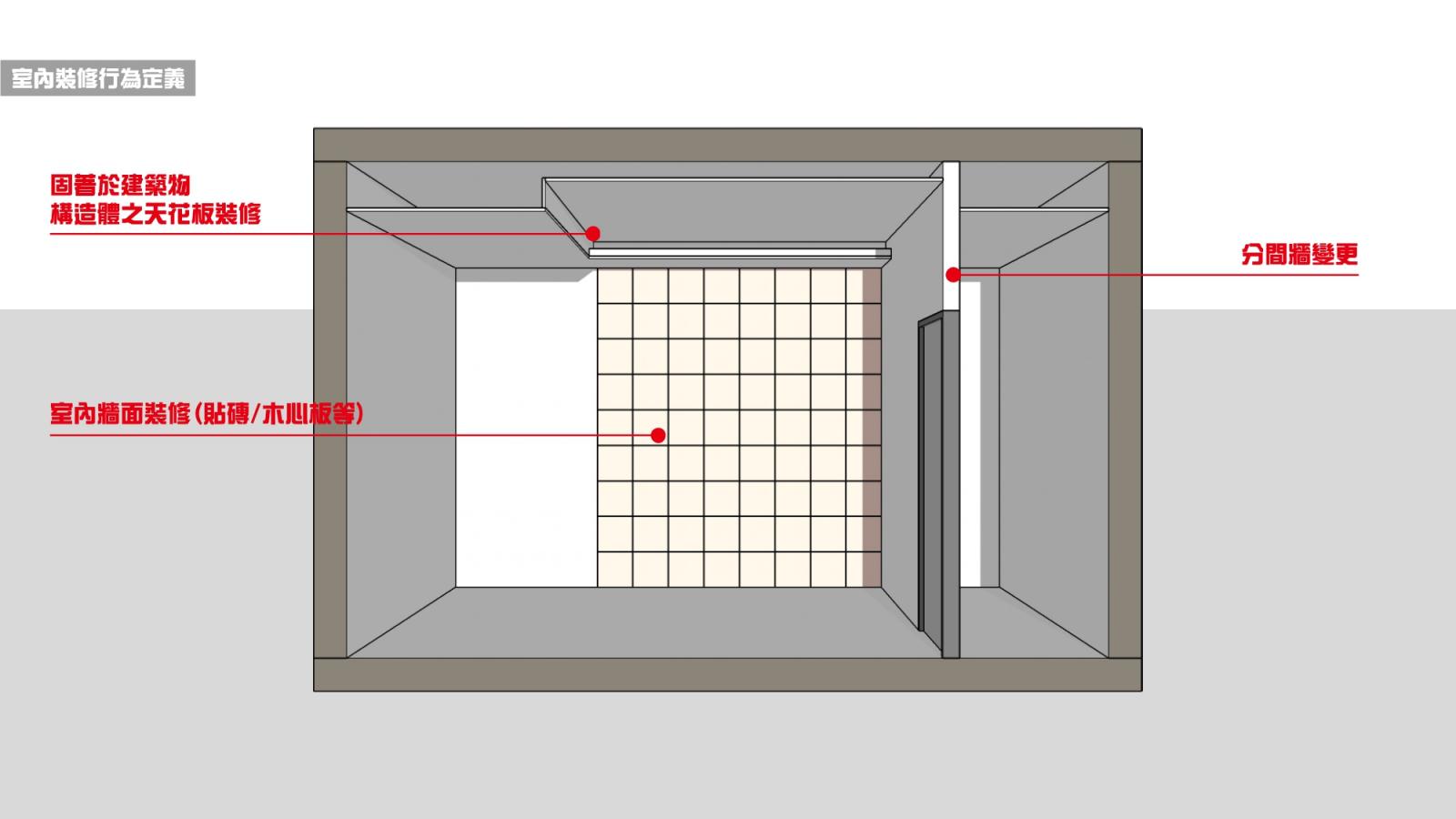 本辦法所稱室內裝修,指除壁紙、壁布、窗簾、地氈、活動隔屏之黏貼及擺設外之下列行為: