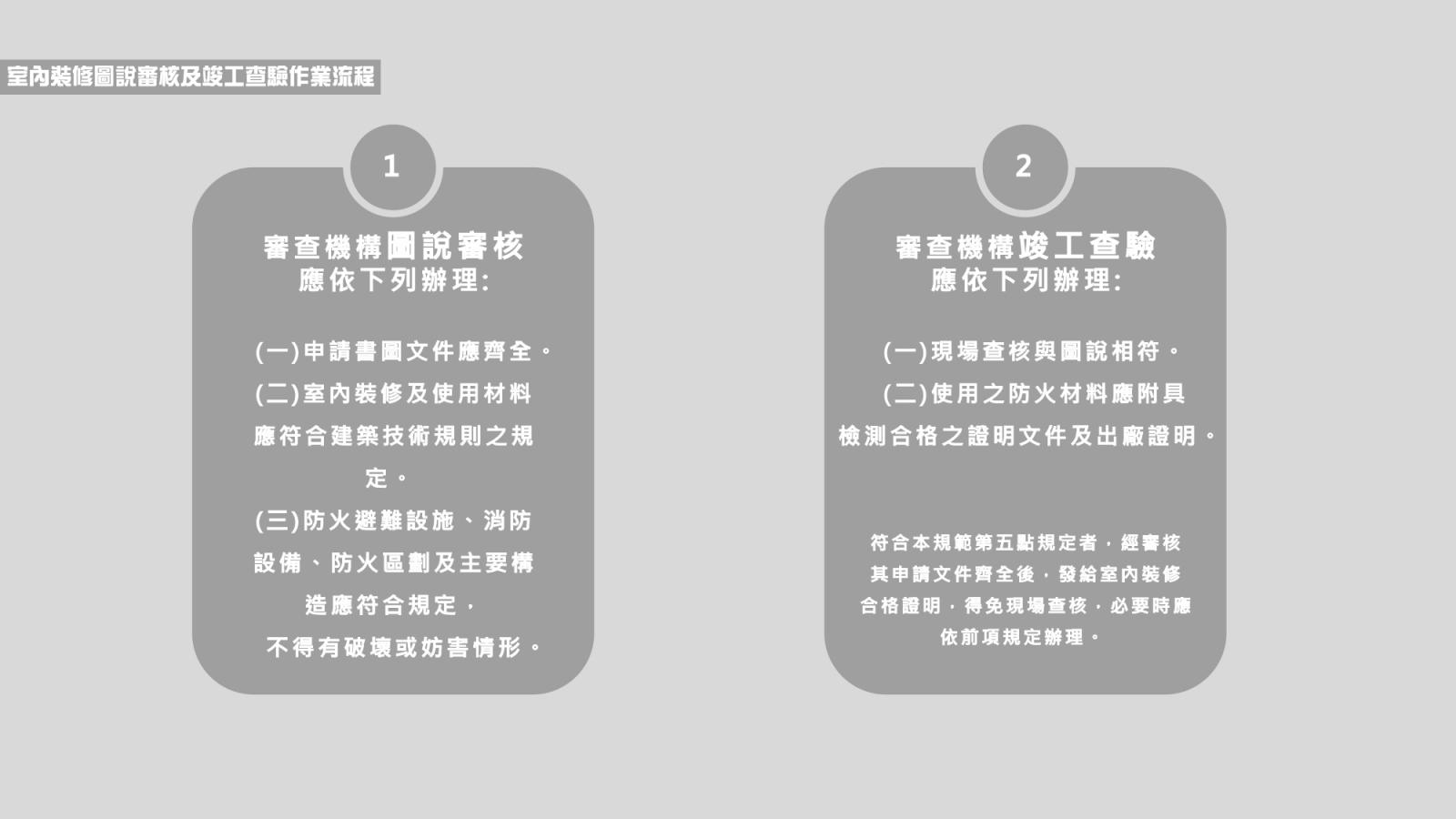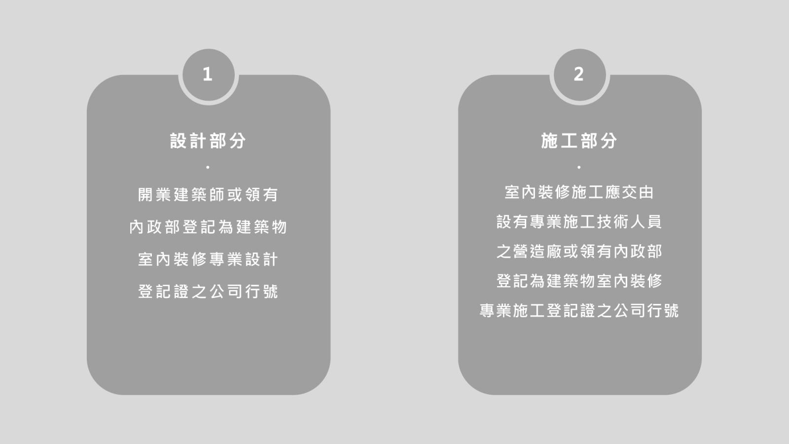▲送審流程分成兩個部分,首先是申請室內裝修施工許可,待工程按圖施工完成之後再申請室內裝修竣工證明。